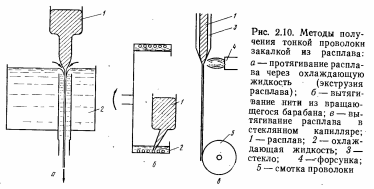 Две разновидности метода: через круглое отверстие и охлаждающую жидкость – метод экструзии расплава (расплавленный металл протягивается в трубке круглого сечения через водный раствор солей) и метод вытягивания нити из вращающегося барабана (струя расплавленного металла падает в жидкость, удерживаемую центробежной силой на внутренней поверхности вращающегося барабана с последующим сматыванием затвердевшей нити при охлаждении); метод Улитовского – Тейлора (протягивание расплава одновременно со стеклянной трубкой; диаметр – 2 – 5мкм, сложность отделения стекла.).