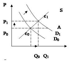 Увеличение цены с P0 до P1 снизит объем покупок с Q0 до Q` если с более высокой ценой не ассоциируется престижность. Но если престижность продукции повысилась, кривая спроса может сместится вправо. Поэтому и потребление может возрасти, скажем, до объема Q1. Таким образом, имеется гипотетическая основа для возможности существования положительно наклоненной кривой спроса mutatis mutandis типа (De) на рис.2.4. Но при этом имеется сильный мотив как для продавцов, так и для «демонстративных покупателей» - фальсифицировать цену товара. Так, если действительная цена товара равна P0, но все, кроме продавцов и «демонстративных покупателей» данного товара, думают, что она равна P1, потребление будет больше (например Q``на рис.2.4.), чем если бы потребитель должен был на самом деле уплатить P1.
