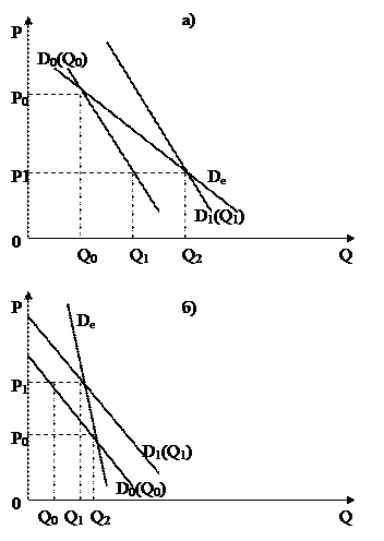 2. Эффект подражания или «эффект присоединения к большинству» (bandwagon effect) имеет место при совпадении увеличения спроса на продукт и возникновении моды на него (рис. 2.3. а). Пусть спрос покупателей на какой-то продукт составил Q0 при цене P0 (рис. 2.3. а). В данном случае линия спроса D0 отражает обычные условия ceteris paribus: неизменные объемы доходов покупателей, вкусов, цен товаров-субститутов и комплиементов. При снижении цены с P0 до P1 отдельный потребитель увеличит объем спроса до Q1. Однако если при этом другие потребители также начнут спрашивать товар в увеличивающихся масштабах и товар войдет в моду, то потребитель увеличит спрос (линия спроса сдвинется вправо до положения D1). При новом равновесии объем потребления модного продукта достигнет уровня Q2. В результате этого возникнет новая кривая спроса mutatis mutandis – De, более чувствительная к изменению цены. В данном случае эффект изменения цены выразился в приращении спроса на Q0 - Q1, а эффект подражания (моды) — в приращении Q1 – Q2.
