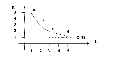 Воспользуемся изоквантой, изображенной на рис. 13. В качестве факторов производства выступают труд L и капитал К, с помощью которых производится 75 единиц продукции Q. Допустим, фирма решила увеличить численность работников и сократить величину используемого капитала, перейдя от варианта а к варианту b.