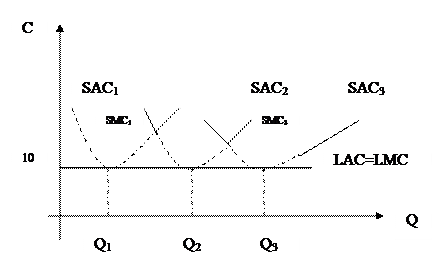 Кривая LАС имеет U-образную форму и никогда не поднимается выше любой из кривых SАС. Точки минимальных средних издержек самого маленького и крупнейшего из предприятий не находятся на кривой LАС вследствие возрастающего и падающего эффекта масштаба на долговременном этапе.