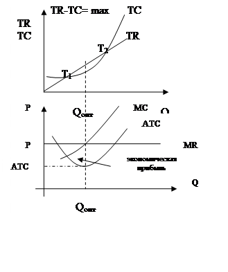 Итак, выполнение условия MR = МС позволяет фирме при любых значениях АТС либо максимизировать экономическую прибыль, либо минимизировать убытки, либо находиться в безубыточном состоянии, извлекая нормальную прибыль.