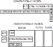 В однопоточной модели процесса, в его представление входит управляющий блок этого процесса и пользовательского адресного пространства, а также стеки ядра и пользователя, с помощью которого осуществляются вызовы процедур и возвраты из них при выполнении процесса, когда выполнение процесса прерывается, содержимое регистра процессора сохраняе-тся в памяти, в много-пользовательской сре-де с каждым процесс-сом также связан уп-равляющий блок и адресное прост-ранство, но теперь для каждого потока соз-даются свои отдельные стеки, а также свой уп-равляющий блок, в котором содержатся значения регистра, приоритет и другая информация о сос-тоянии потока.