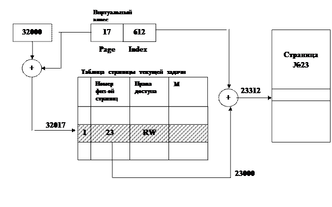 Физический адрес ячейки памяти определяется парой (Pp, i), а виртуальный (Pv, i). Pv – номер виртуальной страницы, Pp – номер физической страницы, а I – номер ячейки (индекс) внутри страницы. Для отображения виртуального адресного пространства на физическую память для каждой задачи необходимо иметь таблицы страниц для трансляции адресных пространств. Для описания каждой страницы диспетчер памяти операционной системы заводит соответствующий дескриптор. По номеру виртуальной страницы в таблице дескрипторов текущей задачи находится соответствующий элемент (дескриптор). Если бит присутствия равен единице, то данная страница находится в ОЗУ и в дескрипторе находится номер физической страницы, отведенной под данную виртуальную страницу.
