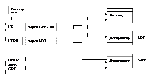 2) Наличие общего разделяемого адресного пространства, поэтому в микропроцессоре i80*86 реализован сегментный способ распределения памяти. Кроме этого, в этих микропроцессорах может быть и страничная организация памяти. Каждый сегмент описывается дескриптором сегмента в котором указывется базовый адрес сегмента, размер сегмента, права доступа и некоторая другая информация. Локальный адрес пространства процесса определяется через таблицу Local Descriptor Table.