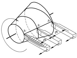 Если придать резцу равномерно-поступательное движение, а конусу равномерно-вращательное, то в результате конец резца, т.е. точка А, оставит на поверхности конуса линию называемую конической винтовой линий. В приведенном примере точка А0 после одного оборота переместиться из положения А0 в положение А1, образуя первый виток, а после второго оборота переместиться из положения А1 в положение А2 и образует второй виток. Расстояние, параллельное оси конуса от точки А0 до точки А1, называется ходом конической винтовой линии.