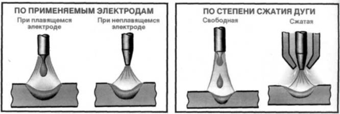 По применяемым электродам различают способы сварки плавящимся электродом и неплавящимся (угольным, графитовым и вольфрамовым). Сварка плавящимся электродом является самым распространённым способом сварки; при этом дуга горит между основным металлом и металлическим стержнем, подаваемым в зону сварки по мере плавления. Этот вил сварки можно производить одним или несколькими электродами. Если два электрода подсоединены к одному полюсу источника питания дуги, то такой метод называют двухэлектродной сваркой, а если больше - многоэлектродной сваркой пучком электродов. Если каждый из электродов получает независимое питание - сварку называют двухдуговой (многодуговой) сваркой. При дуговой сварке плавлением КПД дуги достигает 0,7-0,9.