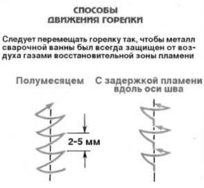 В процессе сварки газосварщик концом мундштука горелки совершает одновременно два движения: поперечное (перпендикулярно оси шва) и продольное (вдоль оси шва). Основным является продольное движение. Поперечное движение служит для равномерного прогрева кромок основного металла и получения шва необходимой ширины.