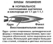 Нормальное пламя получается при соотношении ацетилена и кислорода от 1:1 до 1:9. Нормальное пламя имеет светящее ядро в форме цилиндра с закругленным концом.