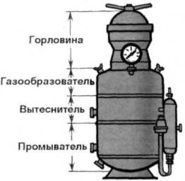 Корпус генератора состоит из трех частей: верхней - газообразователя, средней - вытеснителя и нижней - промывателя и газосборника. Верхняя часть с нижней соединены между собой переливной трубкой. В газообразователе происходит разложение карбида кальция с выделением ацетилена. В промывателе происходит охлаждение и отделение от частичек извести.