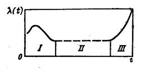 Безотказность характеризуется вероятностью того, что заданном интервале времени или в пределах заданной наработки отказа в изделии не произойдет. Безотказность количественно характеризуется интенсивностью отказов λ(t) во времени. Типичный характер интенсивности отказов изделий машиностроения от начала эксплуатации до утилизации показан на рис 1.1.