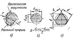 Отклонение формы профиля цилиндрической поверхности в плоскости поперечного сечения (виды отклонения от круглости) – это овалообразность (рис 4.8) и огранка. Овальность – отклонение от круглости при котором реальный профиль представляет собой овалообразную фигуру. При огранке реальный профиль выглядит в виде многогранной фигуры с четным или нечетным числом граней.