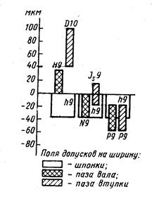 По рекомендациям стандарта на глубину паза вала и втулки высоту шпонки h допуски установлены по грубым 11-14 квалитетам точности. Посадки по ширине шпонки образованы в системе вала, т.е. различные зазоры и натяги обеспечиваются путем изменения полей допусков по ширине пазов в сочетании с полем допуска h9 шпонки по ширине. Для ширины паза вала и втулки, в зависимости от условий работы, рекомендовано назначать три типа шпоночного соединения: