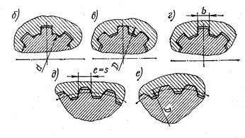Рис. 5.5. Прямобочные (б,в,г) и эвольвентные (д,е) шлицевые