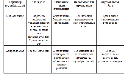 Из таблицы следует, что добровольная сертификация, в отличие от обязательной, решает более широкий круг задач. В частности: подтверждение подлинности продукции, проверка адекватности цены качеству товара, подтверждение соответствия процессов жизненного цикла продукции установленным требованиям и др.
