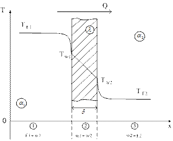 Термическое сопротивление теплопередачи через плоскую стенку равно сумме термического сопротивления теплоотдачи от горячего флюида к стенке
