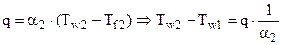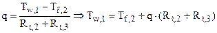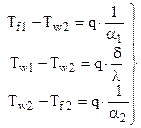 Для решения задачи по расчету теплопередачи через плоскую стенку воспользуемся свойством стационарного режима теплообмена q = const при постоянном λ. Запишем формулы для расчета плотности теплового потока на всех трех участка теплопередачи: