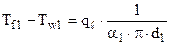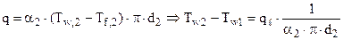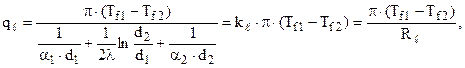 Суммируя перепады температур на всех трех участках теплопередачи, после несложных алгебраических преобразований получаем выражение для расчета линейной плотности теплового потока через цилиндрическую стенку стенку: