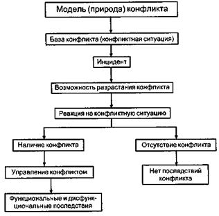 Однако не следует сбрасывать со счетов и тот факт, что отдельные, чаще всего межличностные конфликты носят разрушительный характер. Об этом также должен знать менеджер, так как в совместной деятельности участвуют люди, различные по своей профессиональной подготовленности, жизненному опыту, индивидуальным чертам характера, темпераменту и т.п. Эти различия неизбежно накладывают свой отпечаток на оценки и мнения по значимым для личности и организаций вопросам, порождают порой противоборство, которое, как правило, сопровождается эмоциональным возбуждением и часто перерастает в конфликт. В некоторых случаях столкновения оценок и мнений заходят столь далеко, что интересы дела отходят на задний план, все мысли конфликтующих направлены на борьбу, которая становится самоцелью, что в конечном счете отрицательно сказывается на развитии организации. Модель конфликта показана на рис. 8.1.1.