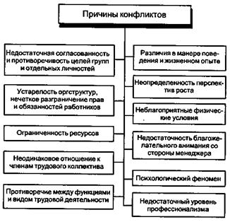 Причинами конфликта могут быть и беспринципность руководителя, ложное понимание им единоначалия как принципа управления, тщеславие и чванство, резкость и грубость в обращении с подчиненными.