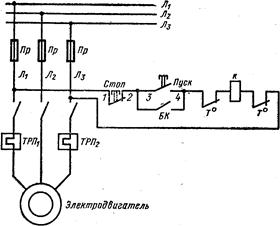 тепловых реле ТРП1 и ТРП2. Катушка электромагнита К подключается к сети через размыкающие контакты тепловых реле Т° и кнопки управления. При нажатии кнопки Пуск напряжение на катушку подается через замкнутые контакты 1—2 кнопки Стоп и замкнутые контакты тепловых реле Т°. После притяженияякоря электромагнита замыкается блок-контакт БК, шунтирующий контакты 3—4 кнопки Пуск. Это дает возможность отпустить пусковую кнопку. Для отключения пускателя нажимается кнопка Стоп. При перегрузке двигателя срабатывают тепловые реле, которые разрывают цепь катушки К. Якорь электромагнита отпадает. Происходит отключение пускателя.