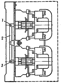 На рис.15 показан общий вид реверсивного пускателя на базе ПМЕ. Подвижная часть верхнего пускателя 1 с помощью рычага 2 сблокирована с подвижной частью 3 нижнего пускателя. При подаче напряжения на верхний пускатель его якорь притягивается, верхний конец рычага 2 поворачивается влево и удерживает якорь нижнего пускателя в крайнем правом положении. Даже при подаче напряжения на нижний пускатель якорь его электромагнита не сдвинется с места, так как сила, действующая на верхнее плечо (якорь верхнего пускателя притянут), больше силы, действующей на нижнее плечо. Поскольку при подаче напряжения на нижний электромагнит в его обмотке протекает большой ток и она может выйти из строя, механическая блокировка дополняется электрической.