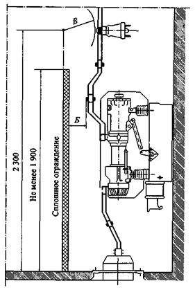 При размещении неизолированных токоведущих частей вне камер и расположении их ниже размера Д по табл. 4.2.7 от пола они должны быть ограждены. Высота прохода под ограждением должна быть не менее 1,9 м (рис. 4.2.17).