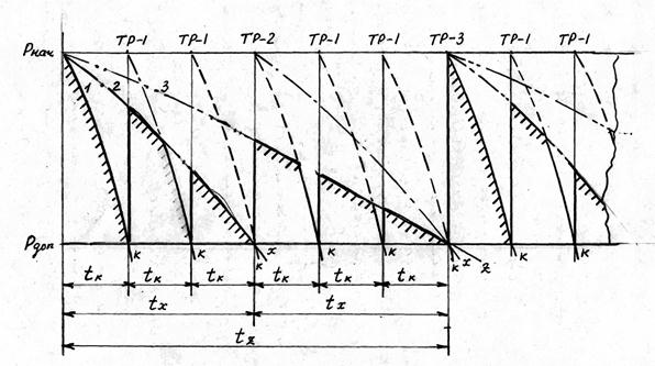На рис. 3 представлена схема формирования ремонтного цикла (ТР-1, ТР-2 и ТР-3). На рисунке tk, tх, t z - наработки на отказ соответственно групп элементов к, х, z с равными наработками на отказ; 1, 2, 3— кривые уменьшения надежности групп элементов; Р шч, Р доп – уровни надежности соответственно начальный и предельно допустимый.