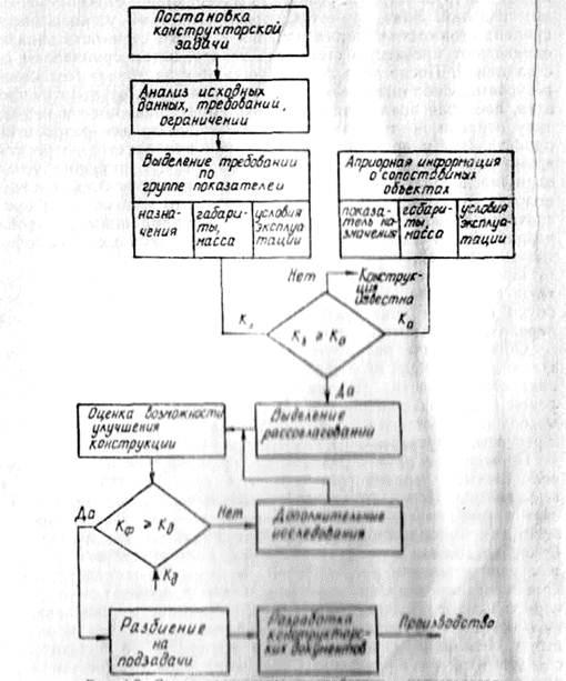 Прежде чем начать разработку, производится исследование сопоставимых изделий (рис. 1.3), т. е. привлекается априорная информация. При этом целесообразно выделить основные свойства разрабатываемой конструкции и известной, а затем произвести их сравнение. Обычно выделяют показатели назначении, габаритно-массовые и эксплуатационные. Если результаты сравнения удовлетворяют разработчика, то принимают конструкцию сравниваемого изделия, если результаты сравнения неудовлетворительны, то выделяются рассогласования и оцениваются возможности улучшения показателей качества, затем производится оптимизация конструкции и сравнение ее показателей с заданными; если результаты сравнения удовлетворительны, то проводится разработка конструкции. При неудовлетворительных результатах сравнения производятся дополнительные исследования и ищутся пути улучшения конструкции.