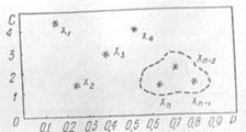 Предположим, что отыскивается оптимальное решение в области двух конфликтующих параметров, например стоимости и надежности. Последовательно задаваясь элементами решений xi находим наиболее приемлемые их значения. Допустим, что нам известна допустимая область изменения элементов стоимости и надежности. Задаваясь дискретными значениями элементов решения, найдем значения показателей стоимости С и надежности Р. Все полученные решения сведем в табл. 3.1. Предполагается, что известна функциональная зависимость между С и Р.
