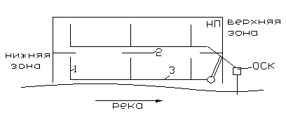 4) Зонная схема – территория разбивается на несколько зон: с верхней зоны стоки на ОСК отводятся самотеком; с нижней – перекачивается НС. В каждой зоне трассировка сетей проводится по одной из вышеперечисленных схем. Применяется при пересеченном рельефе, когда с какой-то части территории невозможно отвести стоки самотеком.