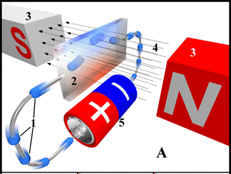 1 – электроны; 2 – пластина; 3 – магниты; 4 – магнитное поле;