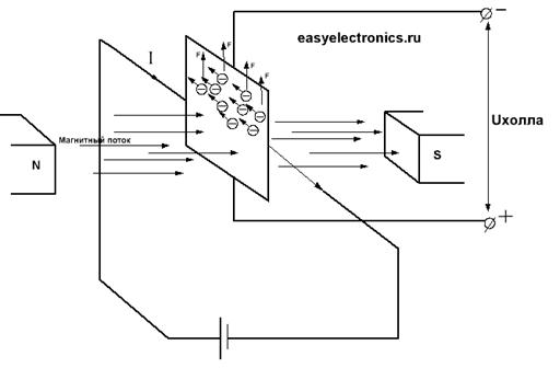 Есть такой интересный эффект — если через квадратную проводящую пластину гнать постоянный ток, а саму пластину пронизать магнитным полем, чтобы линии индукции проходили через ее сечение, то летящие по пластине электроны отклоняются силой Лоуренса. А раз так, то с одного края электронов будет больше чем с другой. Возникает разность потенциалов, то есть напряжение. И чем больше ток и сильней поле, тем большая разность будет. Это и есть эффект Холла.