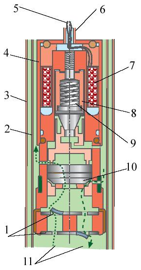 1 – дополнительные клапана; 2 – цилиндр амортизатора; 3 – корпус амортизатора; 4 – корпус клапана; 5 – кабель подвода тока; 6 – полый шток поршня; 7 – обмотка электромагнитного клапана; 8 – якорь; 9 – пружина клапана; 10 – главный клапан амортизатора; 11 – потоки рабочей жидкости