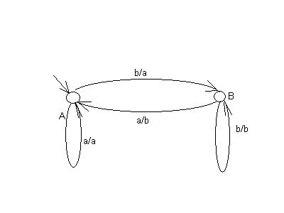Пусть Va = Vb= {a, b}, Q = {A, B}, q0=A. Функции переходов и выходов могут быть заданы в функциональной форме: