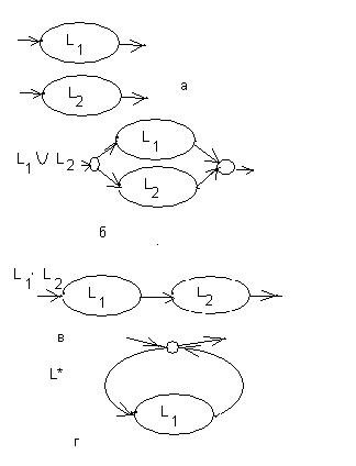 (рис.11 а). Тогда их объединению, конкатенации и итерации языка L1 будут, соответственно, сопоставлены двухполюсники рис. 11б, 11в, 11г