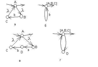 Если из вершины А выходит l-дуга в вершину В, являющуюся начальной вершиной некоторой дуги(не петли) или последовательности дуг, а С – конечная вершина этой дуги (последовательности дуг), и единственная дуга из С - l-дуга в вершину А, то вершины А,В и С можно слить (примеры такого слияния приводятся на рис. 12 (для одной дуги – а, б; для последовательности – в, г).