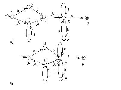 Пример. Пусть автомат представлен диаграммой на рис. 13а. Объединим по правилу 1 упрощения автоматов с l-переходами состояния 4 и 5 и переобозначим состояния, как показано на рис. 13б.