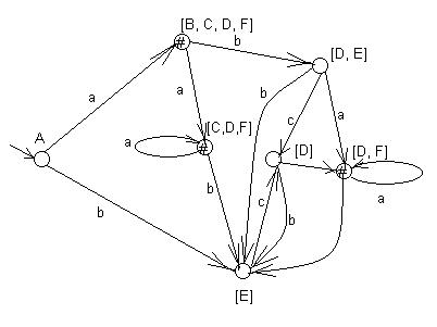 | F(A, a) = [B,C, D, F] F(A, b) = [E] F(A,c) = Æ | F([B, C, D, F], a) = [C,D, F], F([B, C, D, F], b) = [D, E], F([B, C, D, F], c) = Æ, | F([E], a) = Æ, F([E], b) = Æ, F([E], c) = [D], |