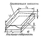 В процессе изготовления деталей возникает погрешность, не только размеров, но так же формы и расстояния номинальных поверхностей, кроме того, режущие элементы любого инструмента оставляют на обрабатываемых поверхностях следы в виде чередующихся выступов и впадин. Эти неровности создают шероховатость и волнистость поверхностей. Таким образом, на чертежах форму деталей задают идеально точными номинальными поверхностями, плоскостями, профилями. Изготовленные детали имеют реальные поверхности, которые отличаются от номинальных отклонений формой и расположением, а так же шероховатостью и волнистостью. Отклонение формы поверхности называется отклонения формы реальной поверхности от номинальной. В общем случае в отклонение формы входит волнистость и не входит шероховатость. Отклонение формы отсчитывается от точек реальной поверхностей до прилегающих поверхностей, прямой, профиля по формам к ним. Прилегающая поверхность – плоскость, соприкасающаяся с реальной поверхностью и расположенная так, чтобы отклонения от неё до наиболее удачных точек реальной поверхности в пределах нормируемого участка имела минимальное значение.