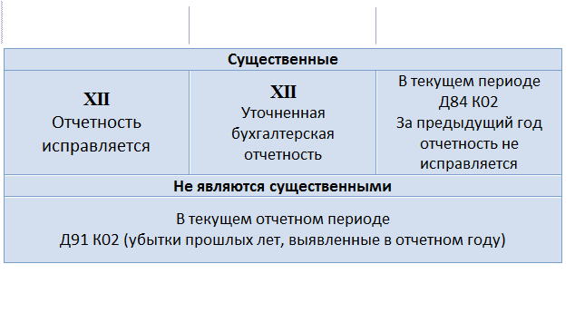 При исправлении ошибок в отчетности имеет значение существенность. Ошибка признается существенной, если она в отдельности или в совокупности с другими ошибками за один и тот же отчетный период может повлиять на экономические решения пользователей, принимаемые ими на основе бухгалтерской отчетности, составленной за этот отчетный период. Существенность ошибки организация определяет самостоятельно, исходя как из величины, так и характера соответствующей статьи (статей) бухгалтерской отчетности.