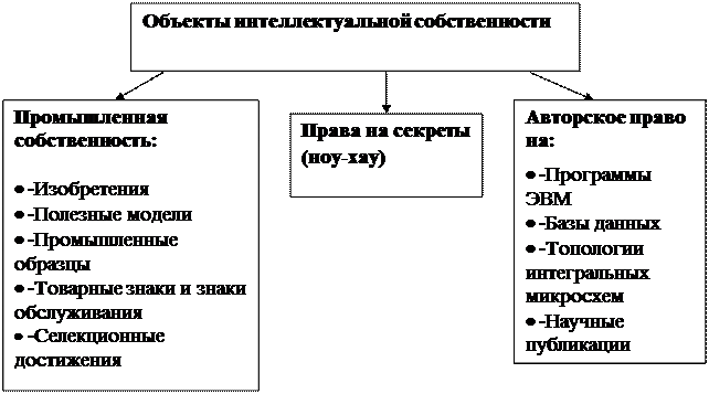 Регламентация этих отношений производится в основном в рамках двух традиционных ветвей права: патентного и авторского.Под действие первой из них попадают отношения в связи с изобретениями, полезными моделями, промышленными образцами. А вторая связана с правоотношениями, касающимися литературных, научных, художественных, музыкальных произведений и других объектов авторского права [90].