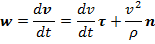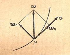 Т.е. проекция ускорения на направление скорости равна производной от модуля скорости по времени, а проекция ускорения на главную нормаль равна квадрату скорости, разделенному на радиус кривизны траектории в той ее точке, где в данный момент находится движущаяся точка. Так как ускорение лежит в соприкасающейся плоскости, то его проекция на бинормаль равна нулю