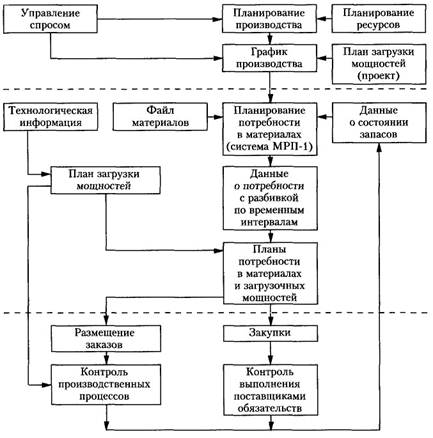 На практике реализованы различные варианты «толкающих» и «тянущих» систем. Примером первых может служить система МРП (система планирования потребности в материалах). Она характеризуется высоким уровнем автоматизации управления, способным обеспечить не только текущее регулирование производственных запасов, но и корректирование планов и действий служб предприятия — снабженческих, производственных и сбытовых. Различают МРП-1 и МРП-2. Последняя включает определение потребности в материалах (функции МРП-1) и служит для управления технологическими процессами и автоматизированного принятия решений. Функциональная схема системы МРП-2, впервые появившаяся в США в 80-е годы XX в., представлена на рис. 6.3.