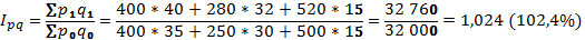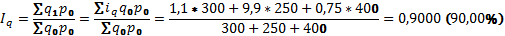 Таким образом, физический объем продукции в отчетном периоде составил 90% от уровня базисного периода, т.е. сократился на 10%.