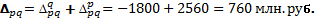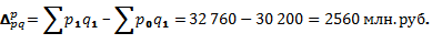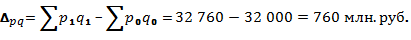 Таким образом, за исследуемый период стоимость всей продукции в целом выросла на 760 млн.руб. Изменение физического объема уменьшило стоимость продукции на 1800 млн. руб., а рост цен увеличил ее на 2560 млн.руб.