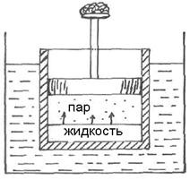 Рассмотрим закономерности, связанные с превращением одной фазы чистого вещества в другую: испарение, плавление, переход твердого тела из одной модификации в другую. Для примера возьмем равновесие между жидкостью и её паром при постоянных температуре и давлении. Для этого поместим жидкость на дно цилиндра, погруженного в термостат. Давление пара, находящегося в равновесии с жидкостью, уравновешено внешним давлением (Рис.10).