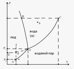 На Рис. 12 приведена диаграмма воды в области средних давлений. Область диаграммы левее кривой AОB соответствует твердому состоянию (лёд). Область диаграммы ниже кривой АОС соответствует газообразному состоянию воды. Часть диаграммы, заключенная между кривыми ОВ и ОС, отвечает жидкому состоянию. Кривые ОА, ОВ, ОС соответствуют равновесию между соответствующими двумя фазами. Кривая ОА выражает зависимость давления насыщенного пара надо льдом от температуры. Кривая ОВ изображает зависимость температуры плавления льда от давления. Наклон кривой OB влево свидетельствует об отрицательной значении производной