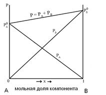 Рассмотрим раствор двух летучих жидкостей А и В. Мольную долю компонента В обозначим x, тогда мольная доля компонента А будет равна (1-х). При постоянной температуре давление насыщенного пара будет функцией только состава раствора. На диаграмме, представленной на рис 13, изображена зависимость давления насыщенного пара раствора от его состава. По оси абсцисс слева направо обычно откладывают мольную долю компонента В, имеющего в чистом виде более высокое давление насыщенного пара и поэтому более низкую температуру кипения. Мольную долю компонента А легко вычислить, учитывая, что сумма мольных долей обоих компонентов, равны единице.