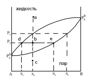 – зависимость давления насыщенного пара от состава пара. Это- линия пара. Любая фигуративная точка, заключенная между ветвями жидкости и пара, отвечает системе с одной степенью свободы. Если через точку «b» проведем изобару, то точки ее пересечения с ветвями жидкости (a) и пара (c) будут характеризовать равновесные составы жидкости и пара соответственно. Такие точки, выражающие составы двух равновесных фаз при заданных T и p, называются сопряженными точками, а линии, соединяющие сопряженные точки (dl), называются нодами, или коннодами. Состав пара отличается от состава равновесной с ним жидкости. При изотермическом сжатии ненасыщенного пара состава x2 фигуративная точка поднимается вверх. В точке «c» пар становится насыщенным, появляются первые капли жидкости состава x1, то есть жидкость обогащена компонентом А по сравнению с равновесным с ней паром. При изотермическом уменьшении давления точка «а», характеризующая жидкую фазу, смещается вниз и при давлении